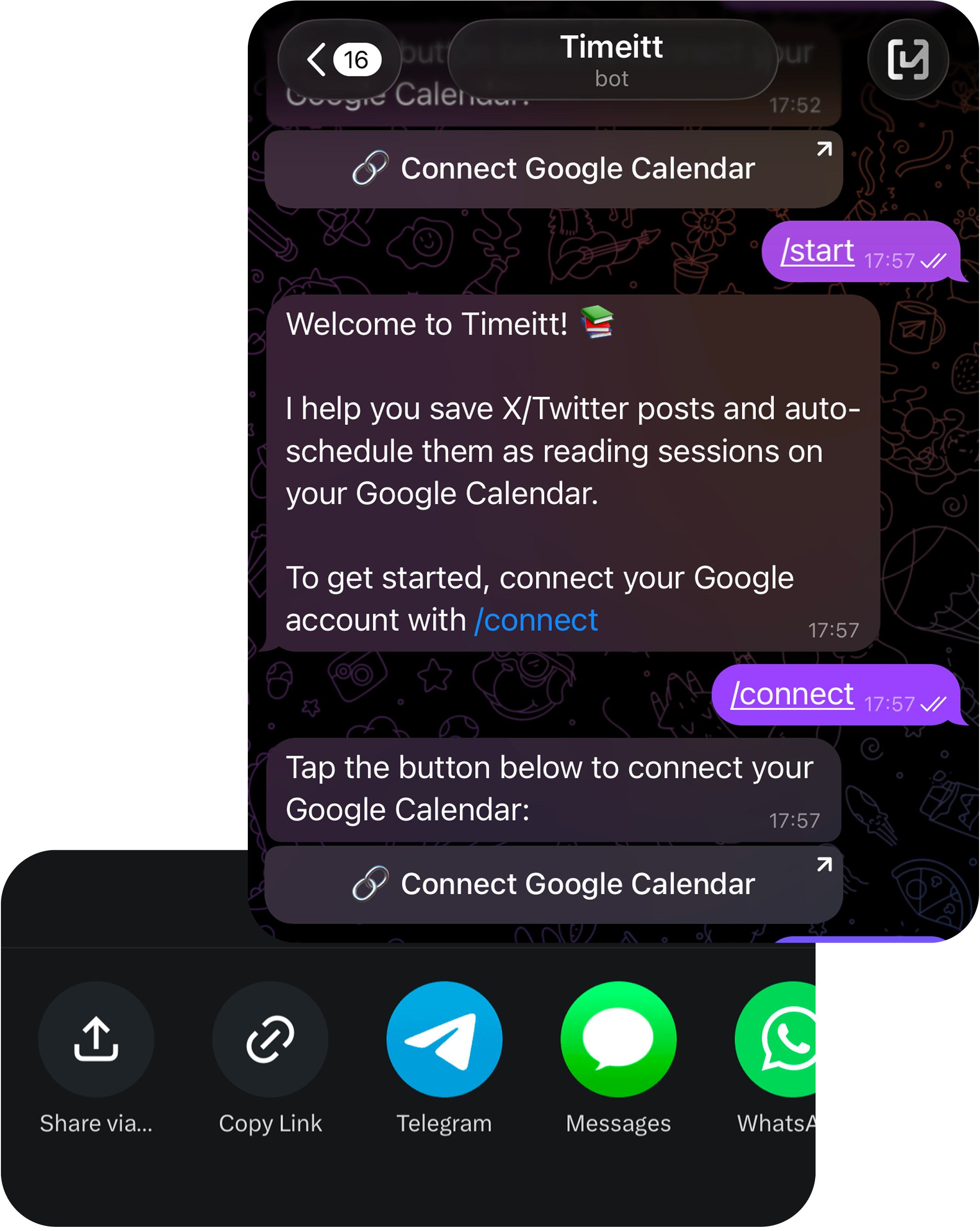 See an interesting tweet on mobile? Share the link to the Timeitt Telegram bot. It saves the post and extracts the content — same auto-scheduling, no extension needed.