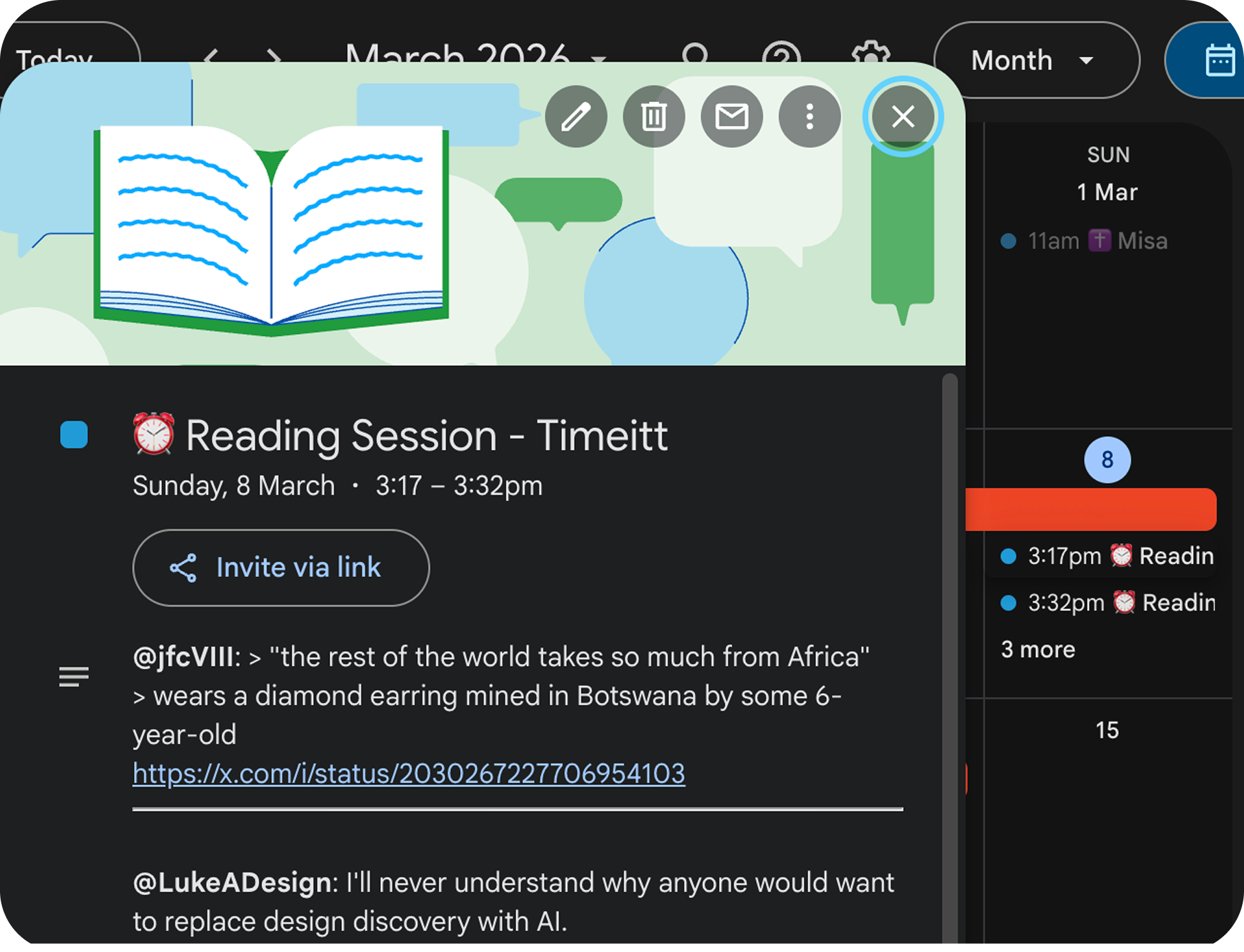 Timeitt finds free slots in your Google Calendar and creates 15-minute reading sessions — no manual work needed.